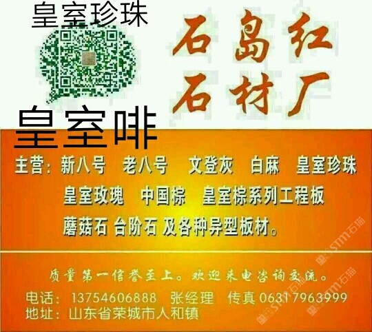 該企業(yè)尚未填寫簡介,請補充!山東石島紅石材廠主營 新八號 老八號 文登灰 白麻 皇室珍珠 皇室玫瑰 中國棕 皇室宗系列工程板 蘑菇石 臺階石 及各種異型板材。質(zhì)量信譽至上。歡迎來電咨詢交流。電話 13754606888 張經(jīng)理 傳真 0631 7963999。 qq 245382641