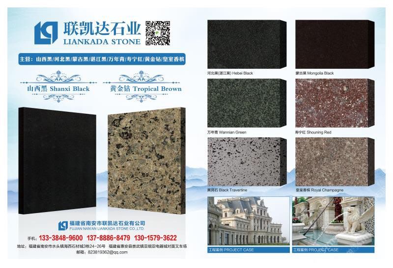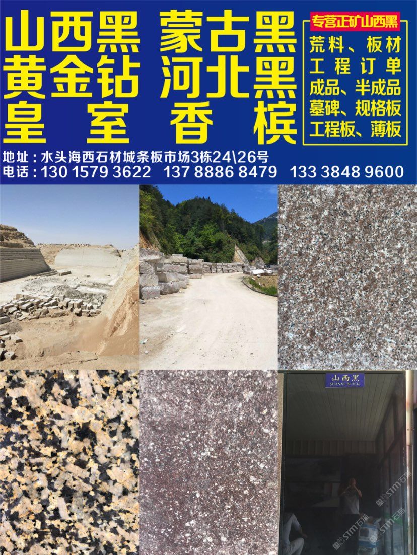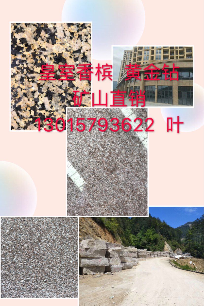 本公司主要經(jīng)營 皇室香檳 黃金鉆/金鉆麻 山西黑 河北黑 壽寧紅/雞血紅 國產(chǎn)皇室啡 荒料 板材 工程訂單 園林景觀訂單 碑石半成品 成品