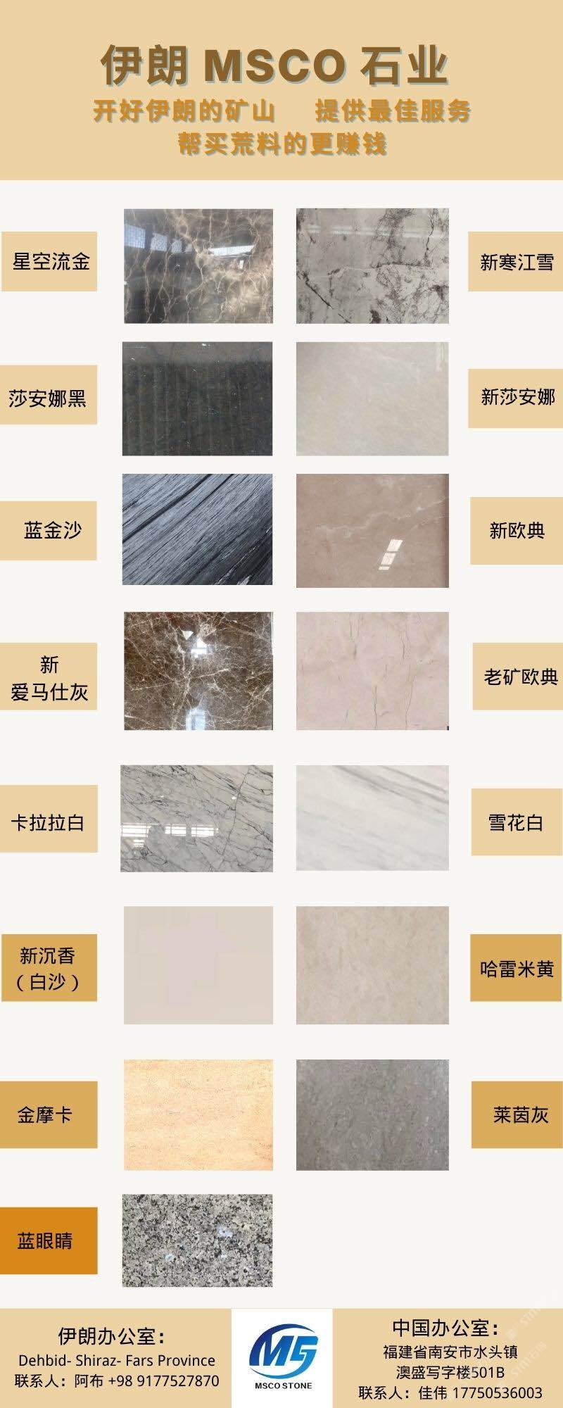 伊朗MSCO公司具備接近15年石材供應(yīng)及礦山經(jīng)營的豐富經(jīng)驗(yàn)。目前我司在伊朗經(jīng)營兩座自有的大理石礦山,此外多年以來已包過近十座礦山。MSCO公司主營產(chǎn)品種類包括大理石,石灰石,花崗巖。對于伊朗新老礦品種感興趣的企業(yè)老板們,歡迎隨時聯(lián)系咨詢我。