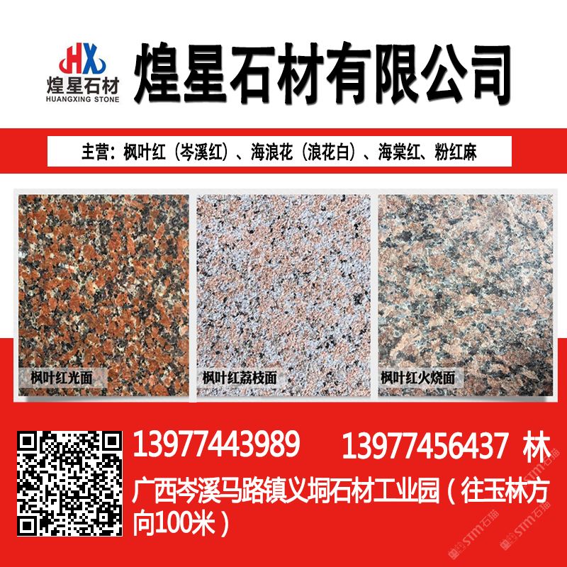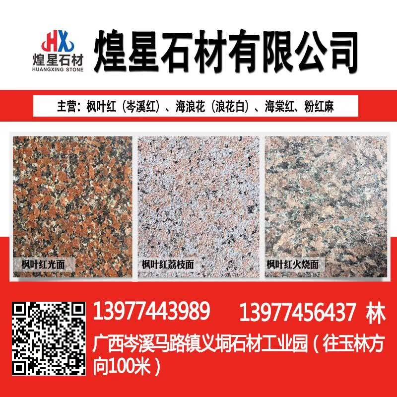 岑溪市煌星石材位于岑溪市馬路鎮(zhèn)義垌石材工業(yè)園,主要生產銷售:岑溪紅(楓葉紅),海浪花,海棠紅,三堡紅,粉紅麻,鐘山青,光板,毛板,火燒板,荔枝面,路沿石,異形板,大板以及各種工程板。\\\\\\\\\\\\\\\