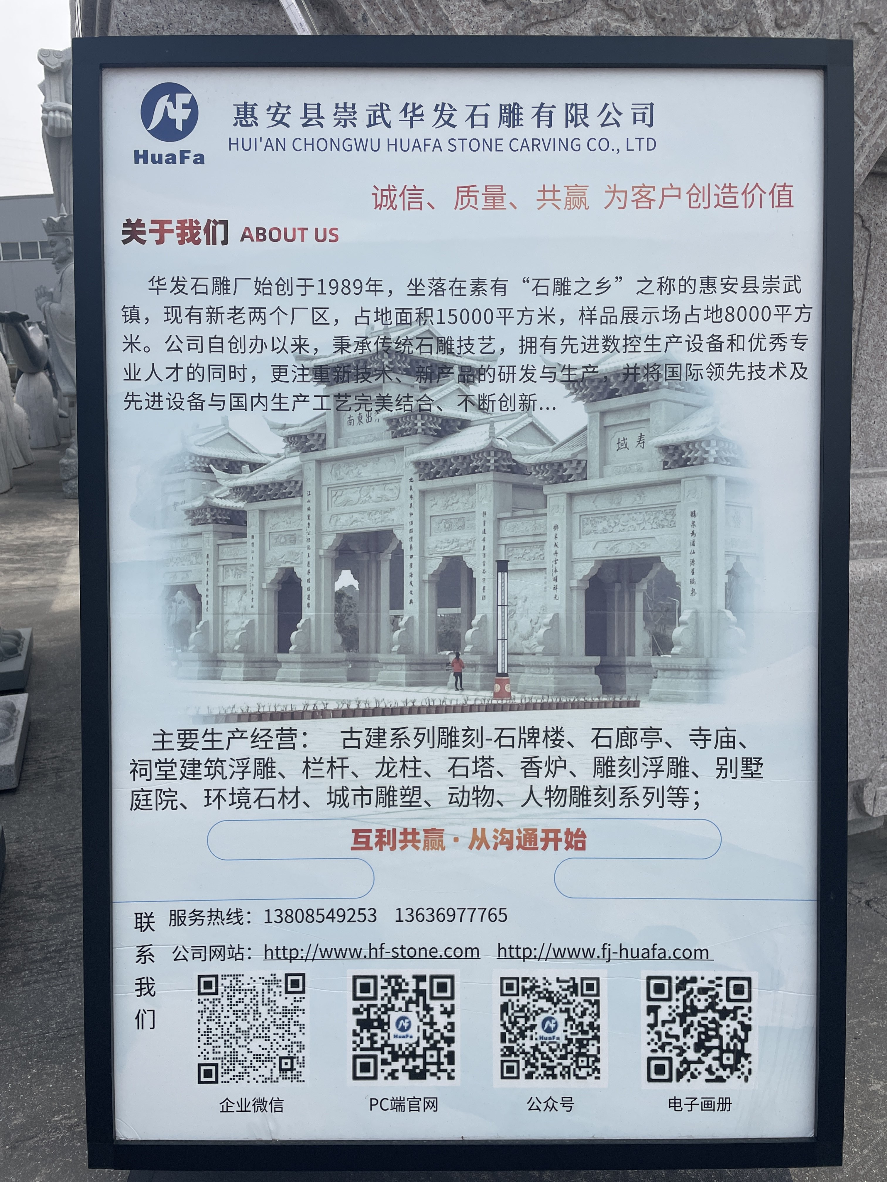 華發(fā)石雕廠始創(chuàng)于1989年,現(xiàn)有新老兩個(gè)廠區(qū),占地面積15000平方米,樣品展示場(chǎng)占地8000平方米。公司自創(chuàng)辦以來(lái),秉承傳統(tǒng)石雕技藝,匯集了一批專(zhuān)業(yè)技術(shù)人才,企業(yè)實(shí)行科學(xué)的質(zhì)量管理體系。