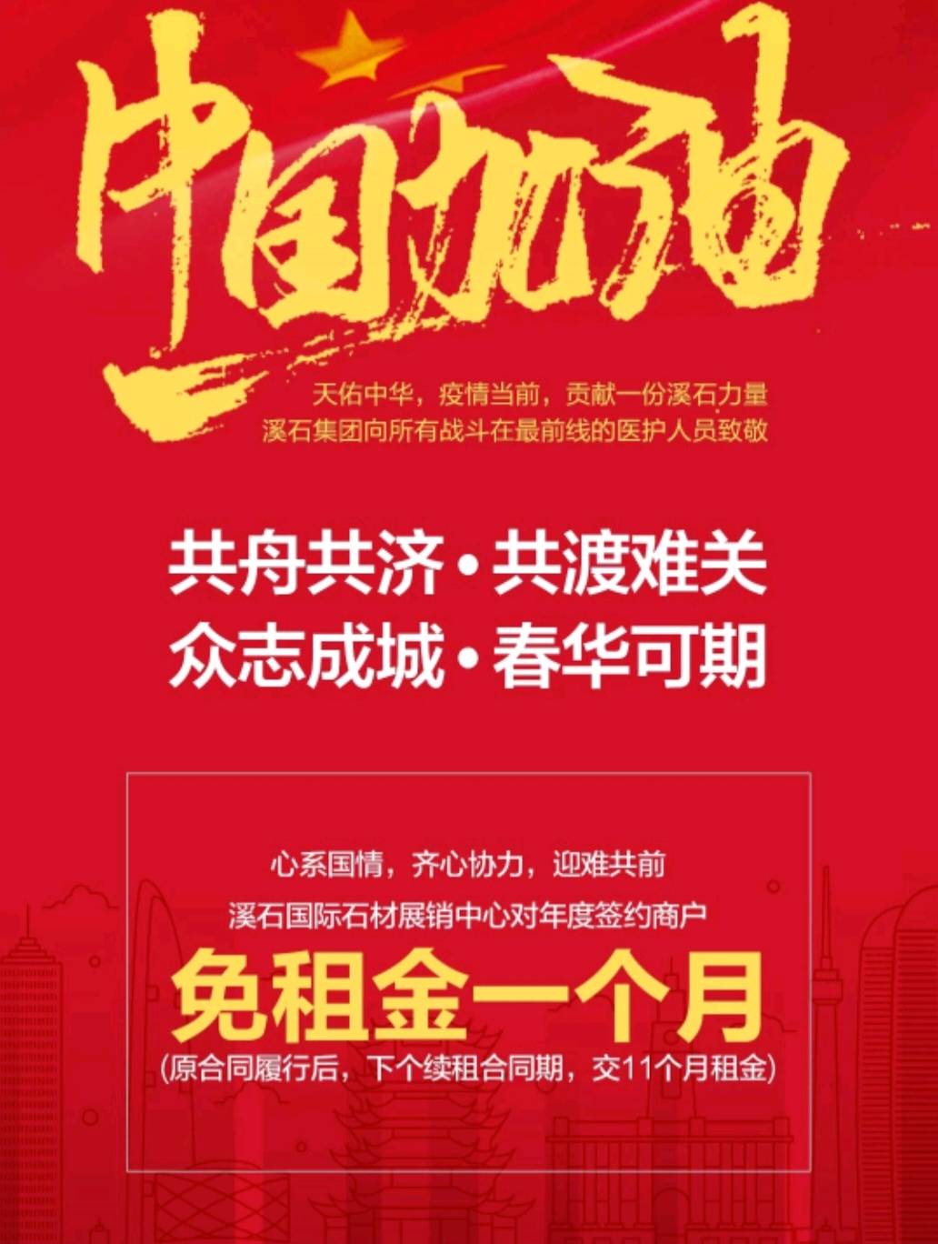 發(fā)布信息: [強][強]天佑中華,疫情當(dāng)前,貢獻一份溪石力量 溪石集團向所有戰(zhàn)斗在前線的醫(yī)護人員致敬! 同舟共濟,共渡難關(guān),眾志成城,春華可期! 溪石國際石材展銷中心對年度簽約商戶 免租金一個月[強][強]
