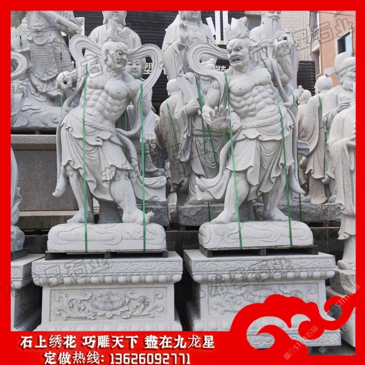 發(fā)布信息: 寺廟門(mén)神哼哈二將石刻像 哼哈二將石雕價(jià)格——九龍星石業(yè)。 寺廟門(mén)神哼哈二將石刻像為明代小說(shuō)《封神演義》作者根據(jù)佛教守護(hù)寺廟的兩位門(mén)神,附會(huì)而成的兩員神將。形象威武兇猛,一名鄭倫,能鼻哼白氣制敵;一名陳奇,能口哈黃氣擒將佛教中守護(hù)廟門(mén)的兩個(gè)神,形象威武兇惡,《封神演義》中把它們描寫(xiě)成兩個(gè)有法術(shù)的督糧官。一個(gè)鼻子里哼出白氣,一個(gè)口中哈出黃氣。用來(lái)比喻有權(quán)勢(shì)者手下得力而盛氣凌人的人(如果碰巧是兩個(gè)),也比喻狼狽為奸的兩個(gè)人。 哼哈二將石雕原名鄭倫,原是商紂王的大將,他拜度厄真人為師。由于鄭倫虔誠(chéng)拜師,認(rèn)真學(xué)法,因此深得度厄真人的鐘愛(ài),于是度厄真人很快授他一種法術(shù),這就是“竅中二氣”。他在“警衛(wèi)”中如遇盜賊,只要鼻子一哼,就會(huì)響如洪鐘,并隨響聲噴出二道白光,可吸敵人魂魄,所以,任何敵人在他面前都會(huì)失敗。 哼哈二將石雕名叫陳奇,他腹內(nèi)有一道黃氣,如果遇到敵人,只要張口哈出一口黃氣,同樣可以吸敵人的魂魄,使敵人呆若木雞,舉手就擒,置敵人于死地。