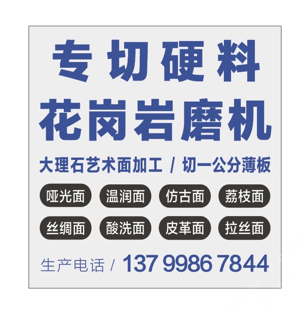 發(fā)布信息: 專切硬料 一公分薄板 花崗巖磨機 三臺靜壓拉鋸 一臺靖佑大理石磨機 一臺靖佑花崗巖磨機 意大利進口磨頭 來料加工 大理石藝術(shù)面 荔枝面 皮革面 溫潤面 仿古面 地址在埭頭村 聯(lián)豐工業(yè)區(qū) 8 號 興業(yè)石材廠 鴻群生產(chǎn)加工中心 馮廠長 13799562486