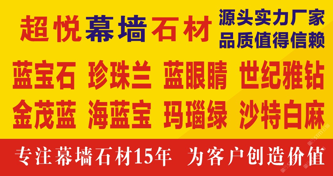 發(fā)布信息: 主營(yíng)藍(lán)色系列 源頭廠家直供 品質(zhì)值得信賴(lài) 藍(lán)寶石 藍(lán)眼睛 珍珠蘭 金茂藍(lán) 新世紀(jì)雅鉆 沙特白麻 專(zhuān)業(yè)生產(chǎn)1cm超薄板 2.5cm干掛板 專(zhuān)注幕墻工程15年 為客戶(hù)創(chuàng)造價(jià)值
