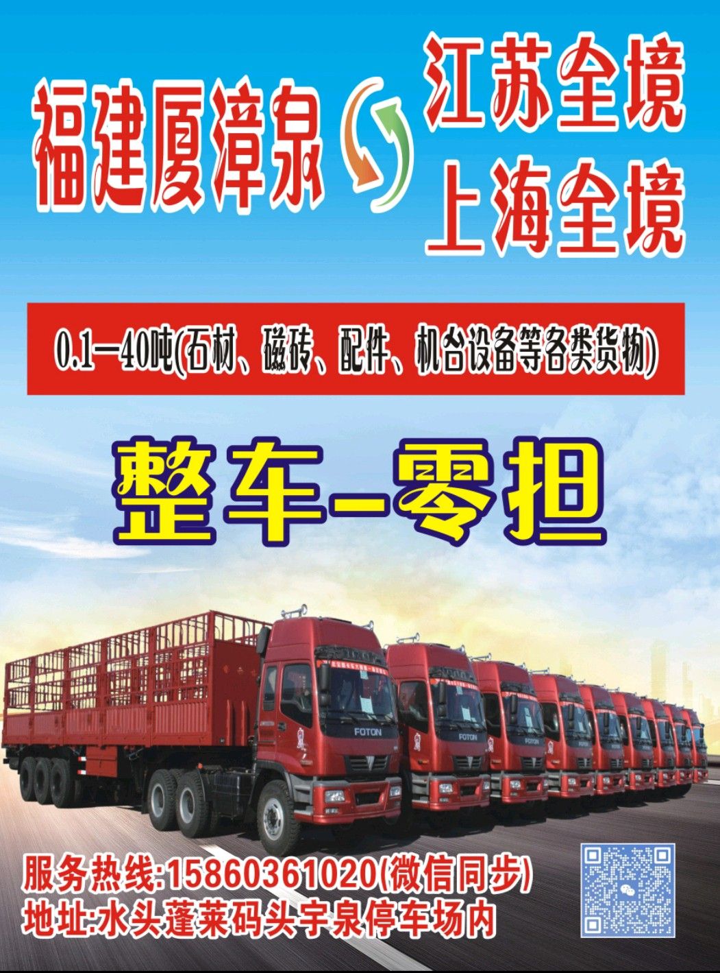 發(fā)布信息: 福建泉州水頭—江蘇,上海全境,往返專線。 零擔(dān)~整車,0.1噸—40噸。 承接各類石材,瓷磚,機(jī)械等各類運(yùn)輸。 專注運(yùn)輸,用心服務(wù)??砷_發(fā)票。 江蘇專線15860361020。(微信同步)