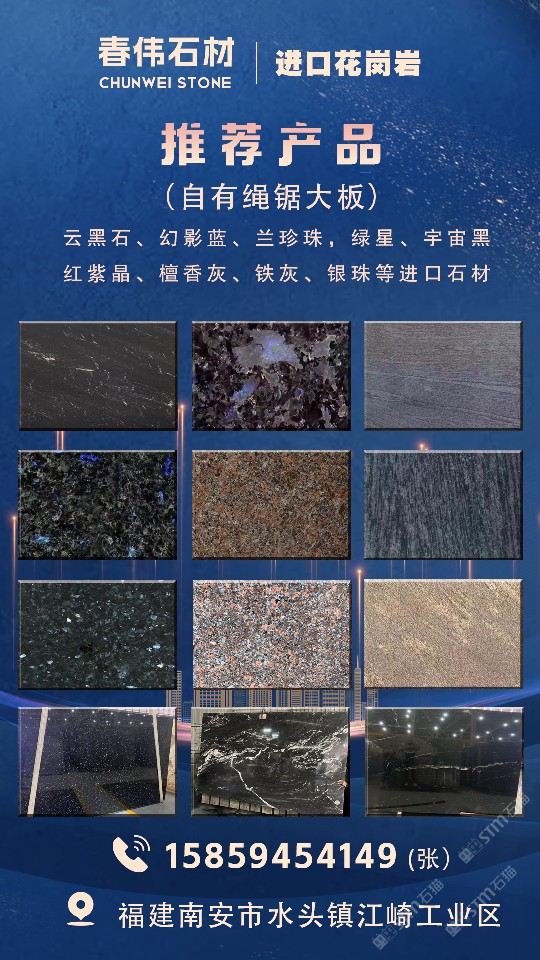 錦華石業(yè)(春偉石業(yè)) 聯(lián)系人:張    135****7118 查看 135****7118 查看 主營范圍: 大板批發(fā)、荒料、花崗巖加工、異型加工、 企業(yè)地址:福建泉州南安市新街南路水頭鎮(zhèn)江崎工業(yè)區(qū)錦華石業(yè)