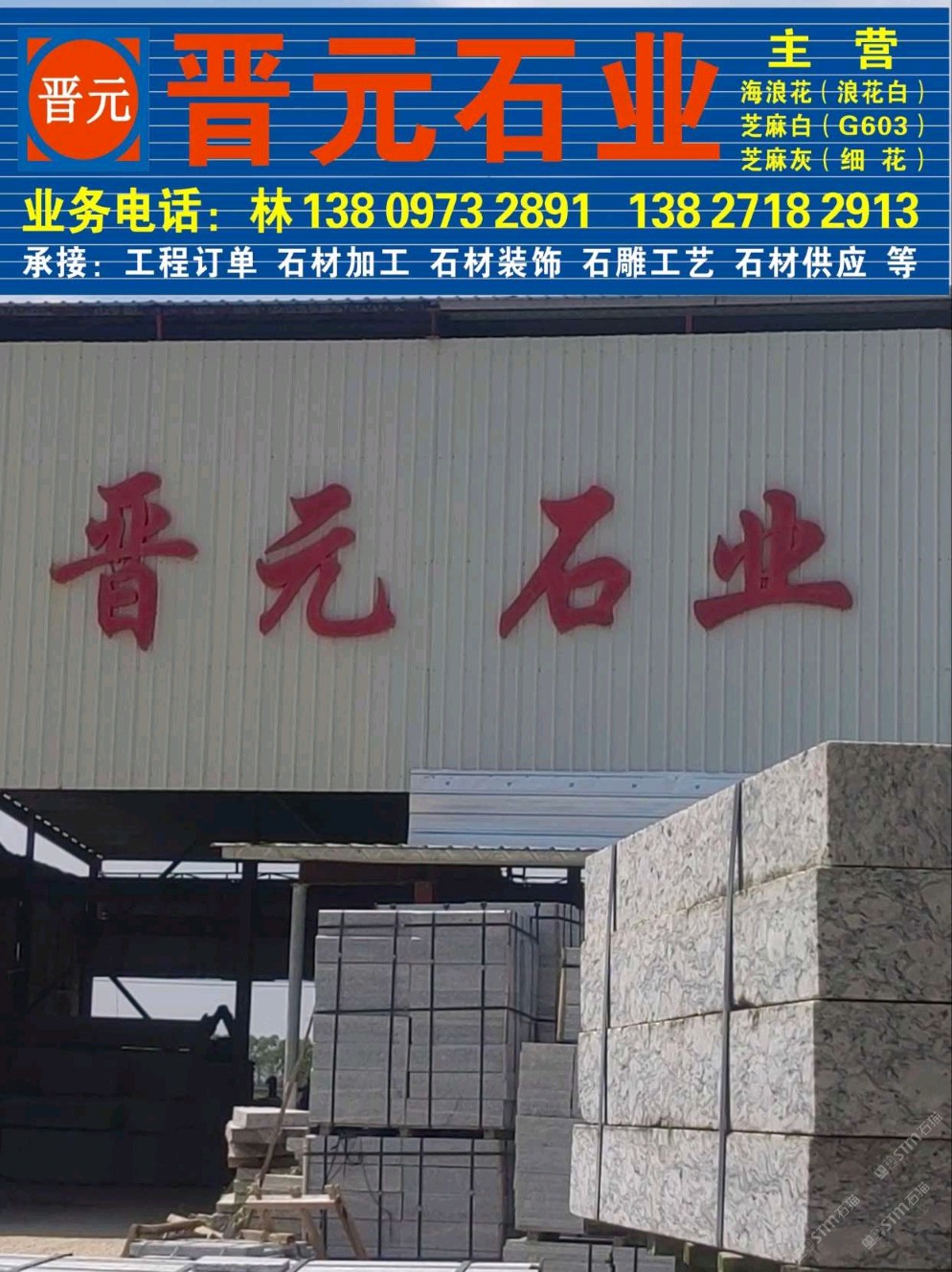 發(fā)布信息: 本廠(chǎng)主要生產(chǎn)加工芝麻灰、芝麻白(廉江白麻)、海浪花(浪花白)等,可加工火燒面、荔枝面、光面、自然面、蘑菇面、路沿石、墓碑石及其它異形加工等。13809732891/13827182913林經(jīng)理