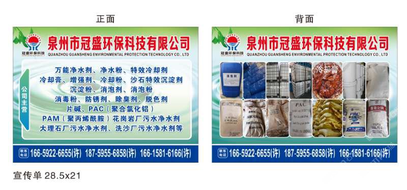 發(fā)布信息: 冠盛環(huán)??萍?6659226655 主營(yíng)產(chǎn)品:凈水劑,冷卻劑,冷卻粉,大理石人造石專(zhuān)用凈水劑,沉淀粉,消泡劑,消毒凈水劑,防銹凈水劑,除銹劑,除臭劑,聚丙烯酰胺,聚合氯化鋁,鹵精,洗沙專(zhuān)用凈水劑,壓濾機(jī)專(zhuān)用凈水劑,陶瓷廠(chǎng)專(zhuān)用凈水劑(黃藥 白藥)等所有水處理環(huán)保材料……