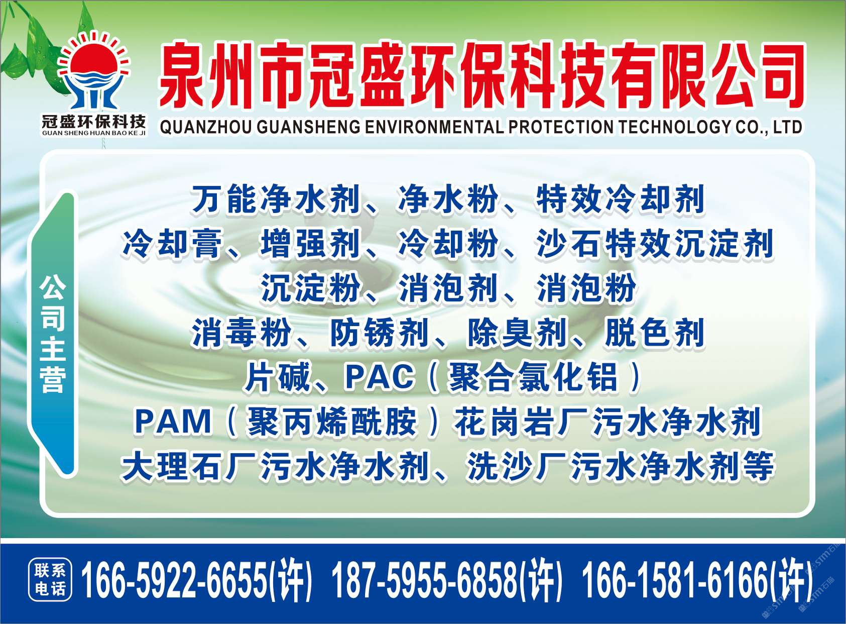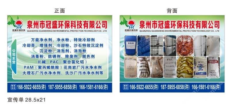 發(fā)布信息: 冠盛環(huán)??萍?6615816166 主營產(chǎn)品:凈水劑,冷卻劑,冷卻粉,大理石人造石專用凈水劑,沉淀粉,消泡劑,消毒凈水劑,防銹凈水劑,除銹劑,除臭劑,聚丙烯酰胺,聚合氯化鋁,鹵精,洗沙專用凈水劑,壓濾機(jī)專用凈水劑,陶瓷廠專用凈水劑(黃藥 白藥)等所有水處理環(huán)保材料……