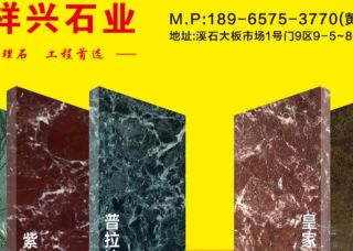 祥興石業(yè)主營產(chǎn)品:深啡網(wǎng),紫羅紅,皇家紫檀1,大花綠,希臘大花綠,大花綠(印度),普拉達(dá)綠(希臘)企業(yè)地址:福建泉州水頭福山工業(yè)區(qū)溪石1號門9區(qū)祥興石業(yè)