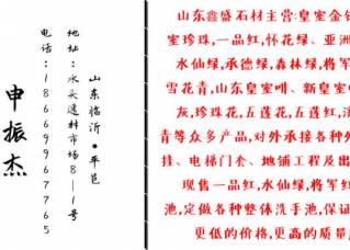 山東天橋石材主營產品:濟南青,山東黑,皇室珍珠,小金鉆,皇室金鉆(大黃),皇室啡,山東銹石,石島紅,皇室珍珠1企業(yè)地址:福建南安水頭鎮(zhèn)閩南第一建材市場37棟15號跟38棟21號